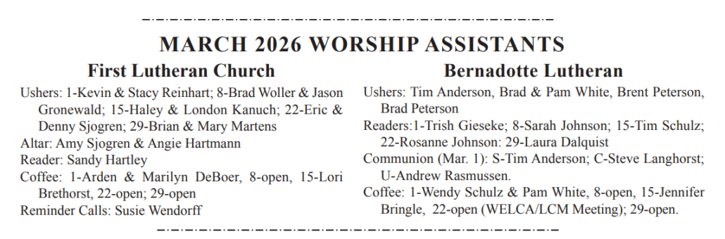 First Lutheran council members were installed at the Sunday, February 22, 2026 worship service. They are Carmen Broste, president; Stacy Reinhart, vice president; Sara Kanuch, secretary; Brad DeBoer, treasurer; and Charlie Hartley, Jean Ahl, Jeff Donnay, and Sandy Burger, at large.