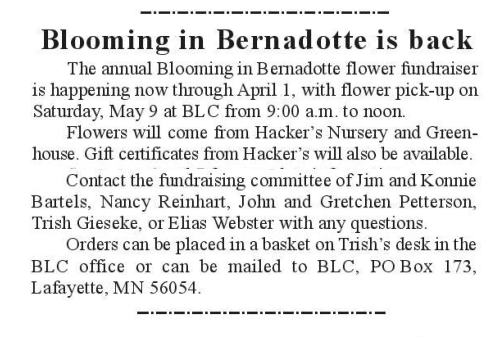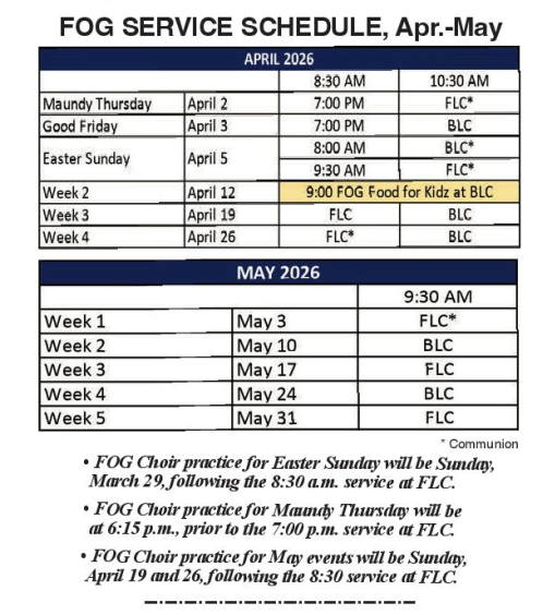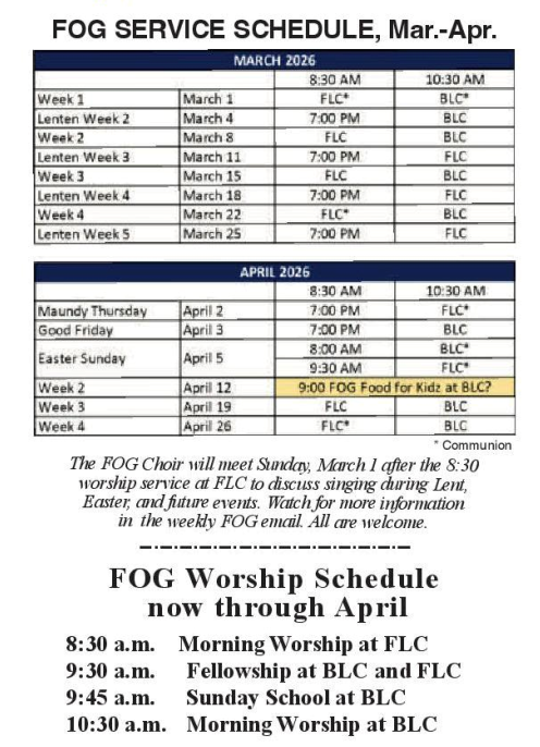 The cost of broadcasting is $165 per week, split between FOG, Scandian Grove & Trinity/St. Paul’s. Sponsorship is welcomed —perhaps in honor or memory of a birthday, anniversary or other special event. Checks may be sent to Kyle Dalquist, c/o BLC, PO Box 173, Lafayette 56054.