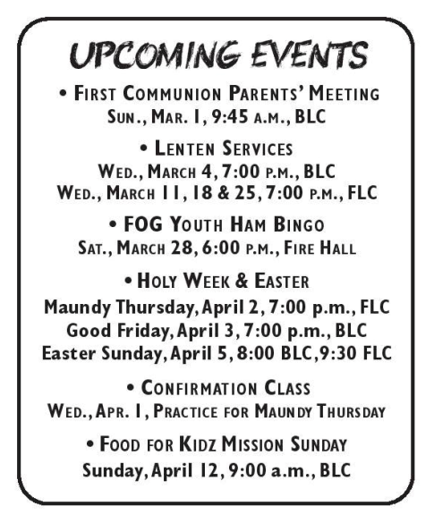 Confirmation will NOT meet Wednesdays during Lent, but will resume on April 1.