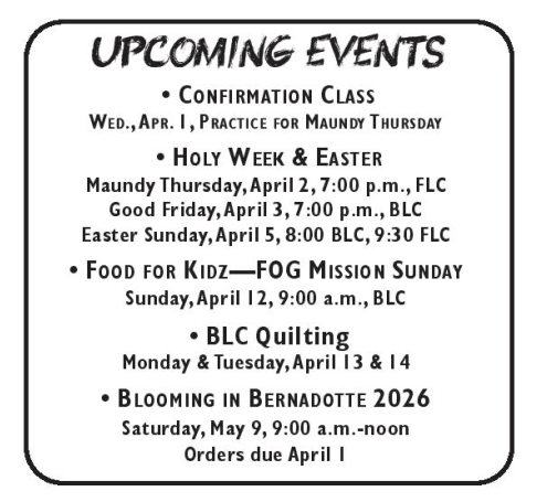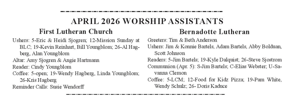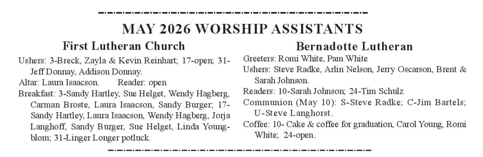 The new members of the Bernadotte Lutheran Church Council were installed at the February 1, 2026 worship service. They are Steve Sjostrom, president; Elias Webster, vice president; Steve Radke, secretary; Tim Anderson, treasurer; Wendy Schulz, financial secretary; and Jim Bartels, John Nelson, Savanna Clemon, Steve Langhorst, and Andrew Rasmussen, members at large.